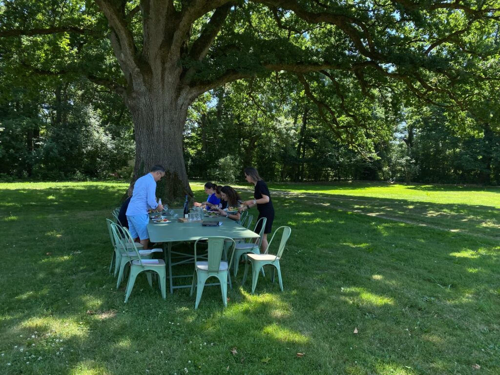 Mais dès que possible, les groupes s’installent sur la terrasse, avec les paper board, les feutres … ou carrément s’emparent du jardin, pour travailler ou déjeuner.